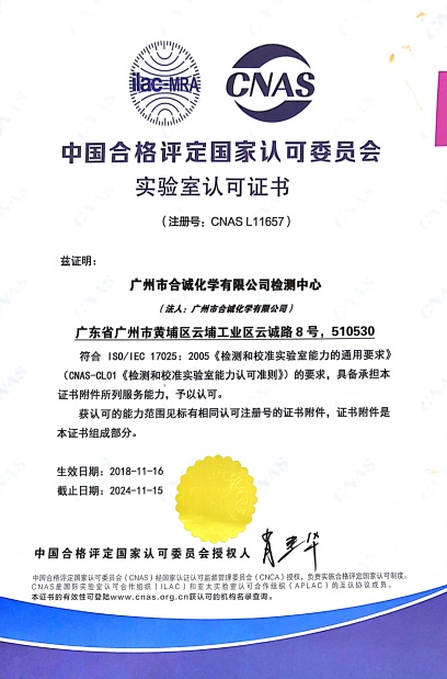 2018年11月16日,合誠技術(shù)股份有限公司旗下檢測機構(gòu)“廣州市合誠化學(xué)有限公司檢測中心”正式通過中國合格評定國家認可委員會(CNAS)的認可,取得CNAS認可證書。至此,我司中心已經(jīng)具備按照相應(yīng)認可準(zhǔn)則開展檢測服務(wù)的技術(shù)能力,技術(shù)水平和能力達到了國際標(biāo)準(zhǔn)。